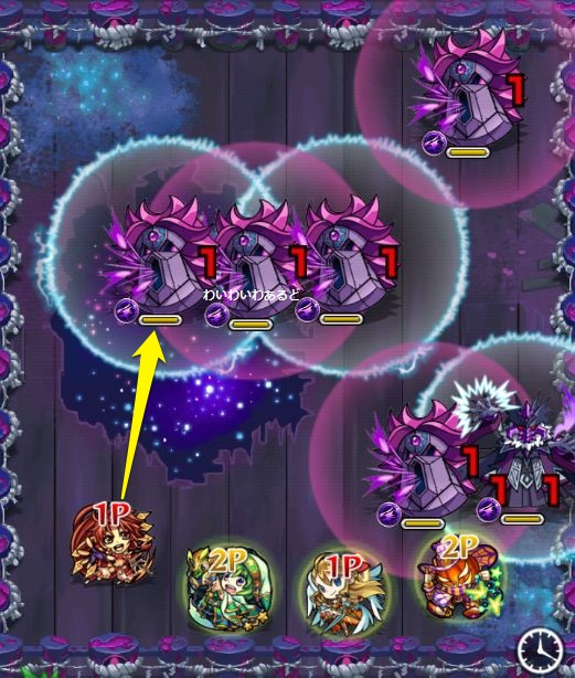 ※ 画像のように、反射タイプのキャラでホーミング吸収のHPゲージの中心から気持ち左を狙って当てるとうまく全滅が狙える。