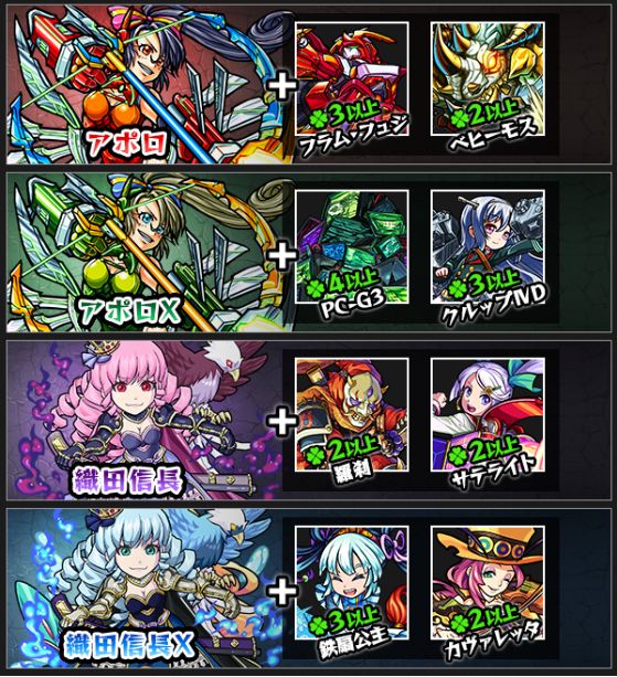 http://wwworld.gg-blog.com/%E3%83%A2%E3%83%B3%E3%82%B9%E3%82%BF%E3%83%BC%E3%82%B9%E3%83%88%E3%83%A9%E3%82%A4%E3%82%AF/%E3%80%90%E3%83%A2%E3%83%B3%E3%82%B9%E3%83%88%E3%80%91%E4%BF%A1%E9%95%B7%E3%80%81%E4%BF%A1%E9%95%B7x%E3%80%81%E3%82%A2%E3%83%9D%E3%83%AD%E3%80%81%E3%82%A2%E3%83%9D%E3%83%ADx%E3%80%81%E3%81%AE%E7%A5%9E%E5%8C%96%E6%83%85%E5%A0%B1%EF%BC%81%EF%BC%81【モンスト】信長、信長X、アポロ、アポロX、の神化情報!!