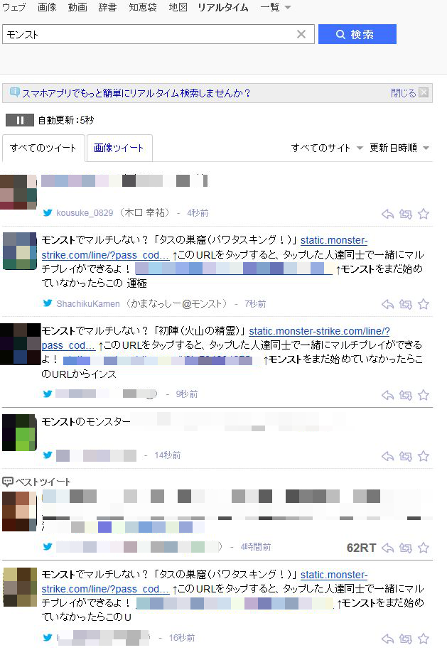 3.すると、ツイッターでガンガン「LINE機能」での募集が流れているので目当ての降臨クエストをクリックして入れてもらいましょう!
