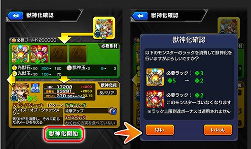 「獣神化」する際に、素材として使いたい獣神竜のラックが、必要ラック数よりも多い場合、必要な分のラックだけ消費して素材にすることができるようになったので、BOXが圧迫されずに済みますね!!