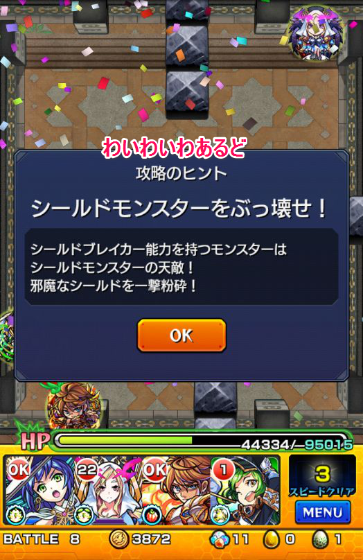 ⇒ ワープが大量に出現するので、AW必須。さらに、雑魚の魔導師が広範囲のレーザーバリアを貼っているので、レーザー系の友情キャラは避けよう。但し、直接攻撃が強いキラー持ちやSSが強いキャラは1体なら友情がレーザーでも組み込んで良い。