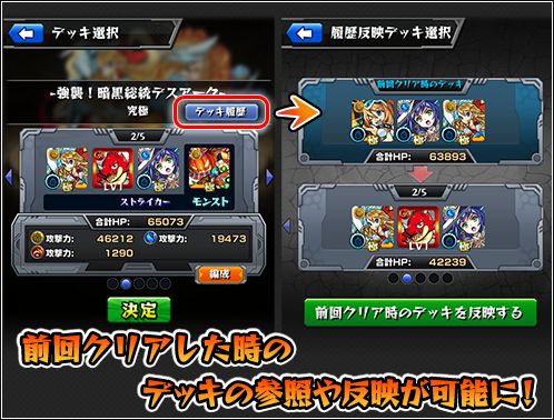 「イベントクエスト」や「英雄の神殿クエスト」の各クエストをクリアした際のデッキ履歴を保存、次回プレイ時に前回クリアしたデッキ情報の参照やデッキ反映が可能になります。
