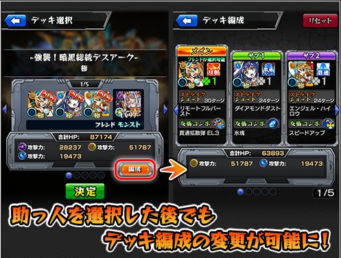 これまで「助っ人」選択後にデッキを再編成したい場合、クエスト選択からやり直す必要がありましたが、「助っ人」を決めた後でデッキを「編成」することが可能になるので、一度選択した「助っ人」のキャラクターを固定したままデッキを組むことが可能になります。