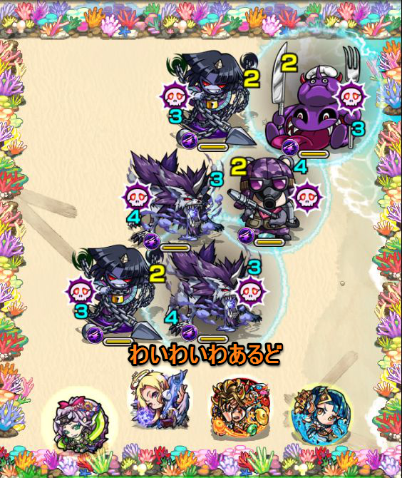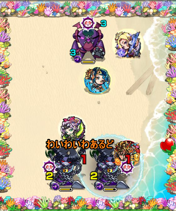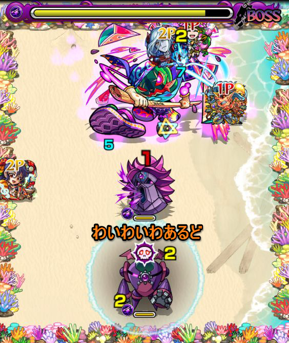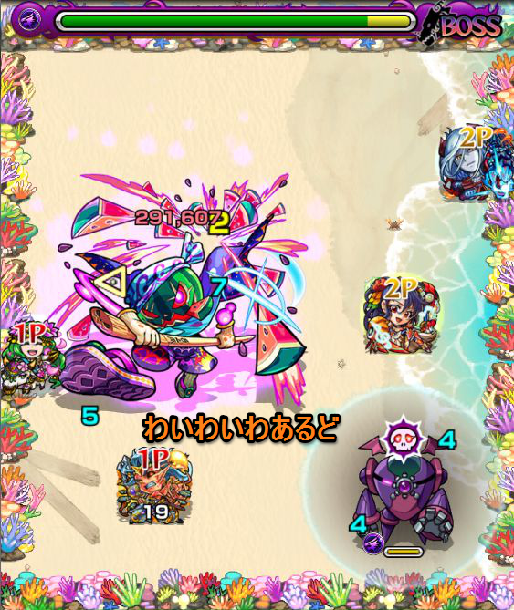 ⇒ 地雷のダメージが1個9900ダメージなのでMS必須。AGB2体+MS2体で編成しよう。ドクロが付いている雑魚はなるべく後に残そう。ダメージウォールを貼られるので、ADWキャラ以外動きづらくなる。