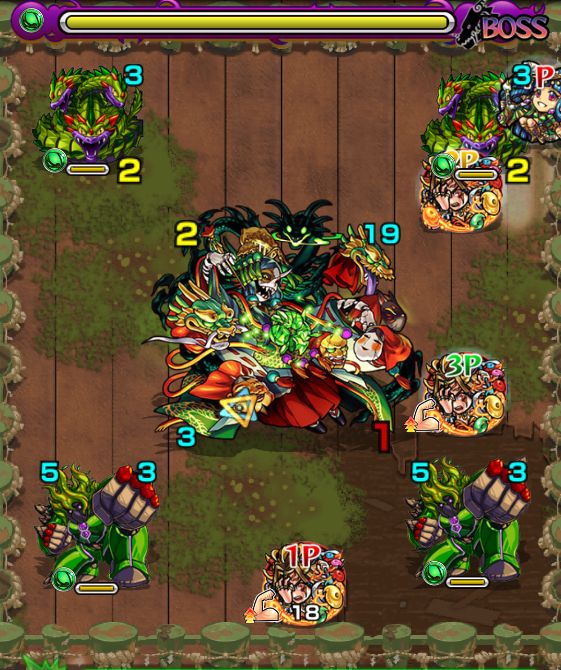 ・左上の大きい雑魚を真っ先に倒さないと大ダメージをくらう。雑魚を全て処理してからBOSSと戦おう。