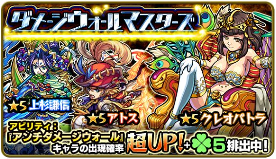 【モンスト】3/17(火)0時より~18(水)「ダメージウォールマスターズ」ガチャ開催! モンスト 2015年03月16日 クレオパトラ、ラファエル、ミカエル、上杉謙信等アビリティがアンチダメージウォールのキャラの排出率超UP&ラック5排出! つづきを読む